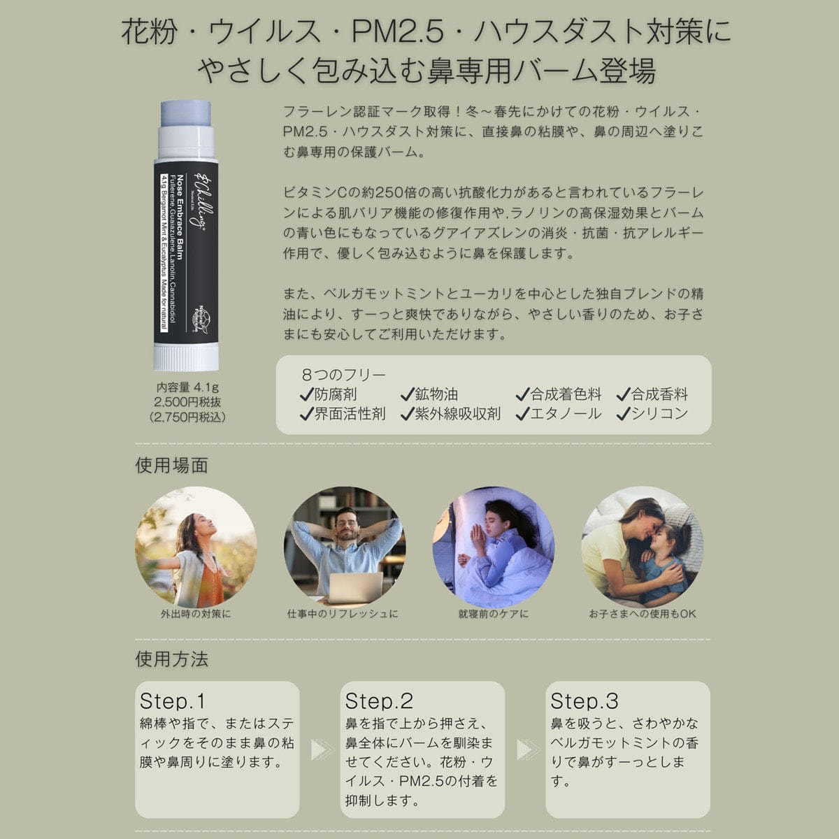 花粉・ウイルス・PM2.5・ハウスダスト対策に、鼻の粘膜や、鼻の周辺へ塗る100%天然由来の鼻専用の保護バーム。